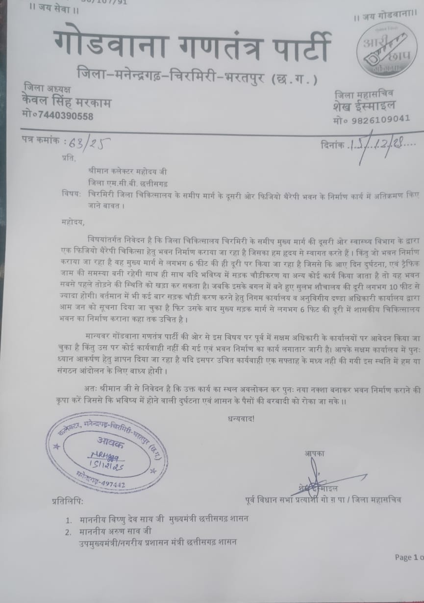 जिला mcb के जिला चिकित्सालय चिरमिरी के सड़क के दूसरी ओर लाखों की लागत से फिजियो थैरेपि चिकित्सा भवन का कार्य चल रहा है जिसके लिए गोंडवाना गणतंत्र पार्टी चिरमिरी के द्वारा शासन प्रशासन का आभार प्रकट किया जाता है। किंतु देखने वाली बात यह है कि मुख्य मार्ग से मात्र छः फिट की दूरी से ही इस भवन का निर्माण कराया जाना कितना सही है ? जिसके लिए गोंडवाना गणतंत्र पार्टी की ओर से चिंता व्यक्त की जा रही है। कि जहां चिरमिरी नगर पालिक निगम एवं अनुविभागीय दंडाधिकारी कार्यालय द्वारा शहर में अतिक्रमण किए हुए मकानों को तोड़ने का नोटिस दिया गया था किंतु शहर वासी जिला चिकित्सालय के संचालन के लिए बिना किसी विरोध के स्वेच्छा से अपने दुकान एवं मकान को तोड़वा