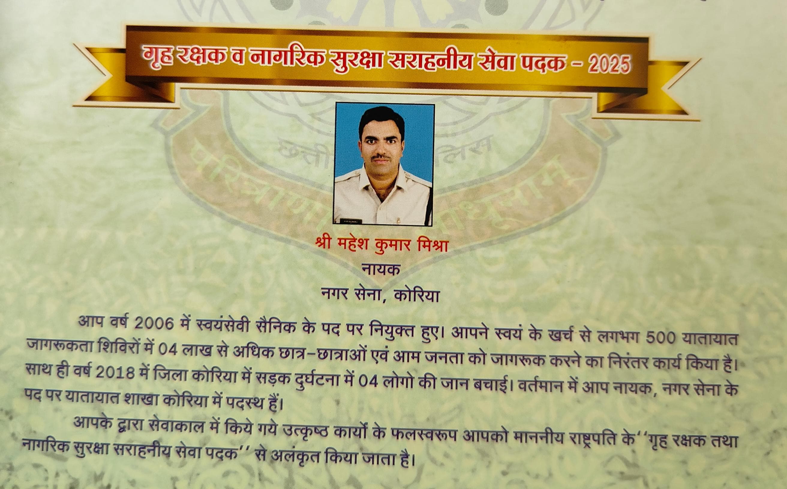 समाज एवं जनहित में कर रहे हैं। इन्हीं सब सेवा भावों को देखते हुए नायक महेश मिश्रा को देश के सर्वोच्च सम्मान में शुमार राष्ट्रपति का गृह रक्षक एवं नागरिक सुरक्षा पदक 2025 से स्वतंत्रता दिवस के अवसर पर प्रदेश की राजधानी रायपुर में आयोजित मुख्य समारोह में मुख्यमंत्री विष्णु देव साय के हाथों इन्हें राष्ट्रपति पदक से नवाजा गया है।