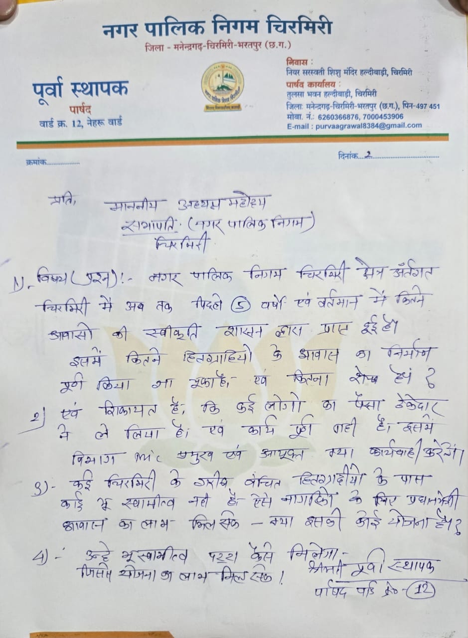आज दिनांक 25 जुलाई को चिरमिरी नगर निगम के सभा गृह में प्रथम सामान्य आयोजित हुई जिसमें महापौर राम नरेश राय, सभापति संतोष सिंह एवं नेता प्रतिपक्ष श्रीमती गायत्री बिरहा ,एवं क्षेत्र के सभी पार्षदगण उपस्थित थे, सभा ग्रह में सवालों का सिलसिला लगातार जारी रहा। वही वार्ड न 12 की पार्षद पूर्वा स्थापक ने निम्नलिखित जनहितकारी मुद्दे सदन में प्रस्तुत किए: जो इस प्रकार रहे