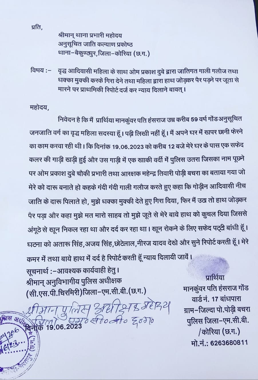 बैकुंठपुर :_ जिला पंचायत अध्यक्ष रेणुका सिंह ने पत्र लिखते हुए कोरिया एसपी को शिकायत किए है की पुलिस सहायता केंद्र बचरा पोंडी में पदस्थ SI ओम प्रकाश दुबे तथा आरक्षक महेंद्र तिवारी के द्वारा बिना सर्च वारंट के जबरन एक आदिवासी महिला के घर घुस कर मारपीट और जातिगत गाली गलौच किया,पीड़िता के अनुसार उसको जूता से मारा गया और हाथ में खून निकल रहा है। रेणुका सिंह ने बताया की ऐसे