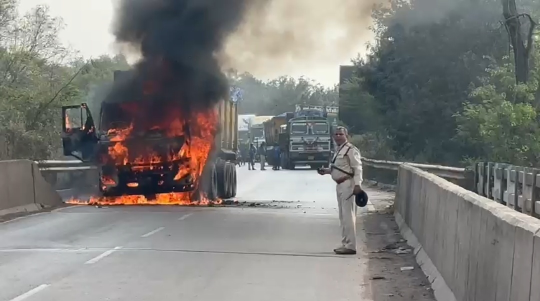 चलती ट्रक में लगी आग ट्रक जल कर हुए स्वाहा