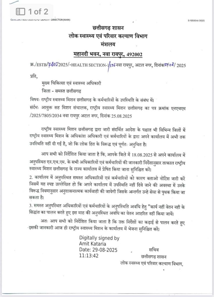 आदेश पत्र में कहा गया है कि आदेश के बाद भी अधिकांश जिलों में NHM अधिकारी-कर्मचारी कार्यालय नहीं पहुंच रहे हैं, जो लोकहित के विरुद्ध है और अनुचित है. कार्यालय में उपस्थित नहीं होने पर कर्मचारी को नोटिस जारी करें, जिसमें लिखा हो कि उपस्थित नहीं होने की स्थिति में उनकी सेवा समाप्त की जाएगी. सभी सीएमएचओ को यह भी निर्देशित किया गया है कि अनुपस्थित अधिकारी कर्मचारियों के कार्य नहीं वेतन नहीं के सिद्धांत पर इस माह का वेतन आहरित ना किया जाए.