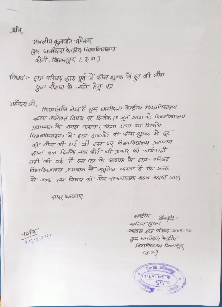 गुरु घासीदास केंद्रीय विश्वविद्यालय छात्र परिषद ने की विश्वविद्यालय प्रवेश परीक्षा ऑनलाइन कराने की मांग*