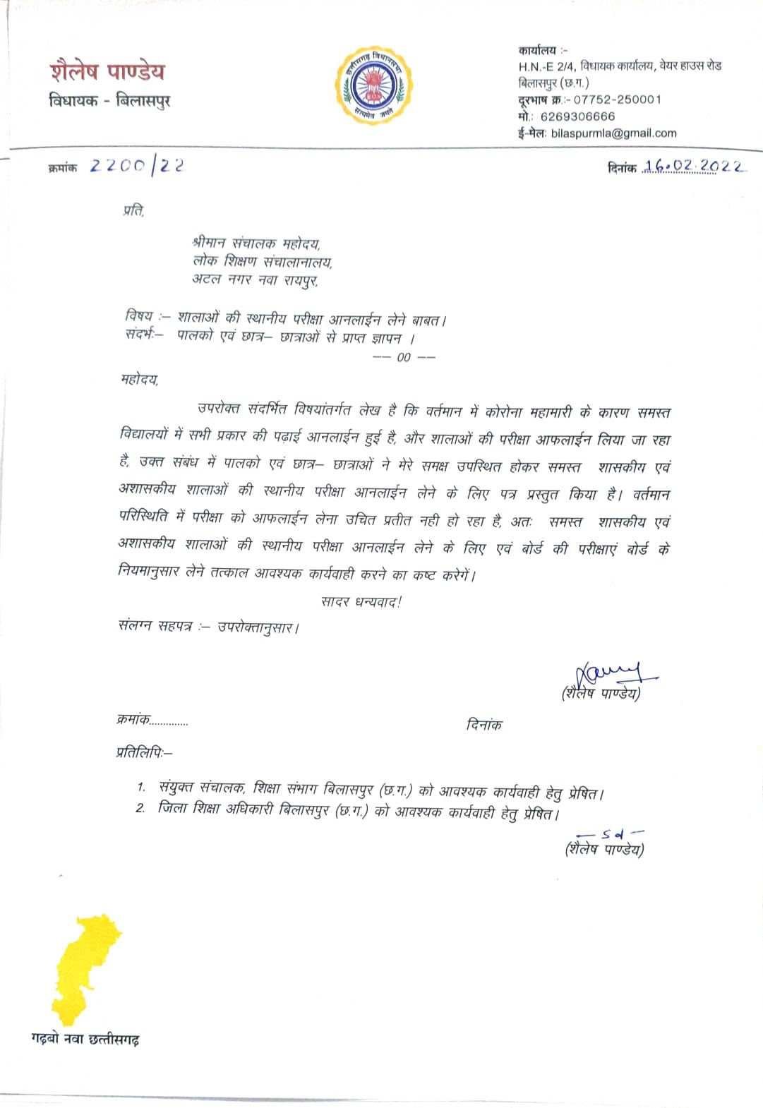 आपको बाता दें कोरोना के बढ़ते मामलो को देखते हुए इस साल भी अधिकांश पढ़ाई ऑनलाइन क्लास के माध्यम से आयोजित हुई है पर अचानक ऑफलाइन परीक्षा लेने की बात कही जाने लगी, जिसे देखते हुए पालको और छात्र छात्राओं ने इसका लगातार विरोध् किया, साथ हि इसकी शिकायत नगर विधायक शैलेश् पंडे से भी की गई, जिस पर संज्ञान लेते हुए वे विभाग के उच्च अधिकारियों को पत्र के माध्यम ऑनलाइन परीक्षा लेने अग्रह किया, जिसके बाद स्थानीय कार्यालय ने राजधानी के उच्च कार्यालय से इस संबंध में मार्गदर्शन मांगा था,वही अब डीपीआई के दिशा निर्देश अनुसार स्थानीय व्यवस्था एवं कोरोना महामारी को ध्यान में रखते हुए समस्त स्थानीय परीक्षाएं ऑनलाइन संचालित होंगी, इस संबंध में बिलासपुर शिक्षा संभाग के संयुक्त संचालक ने आदेश जारी कर दिया है।