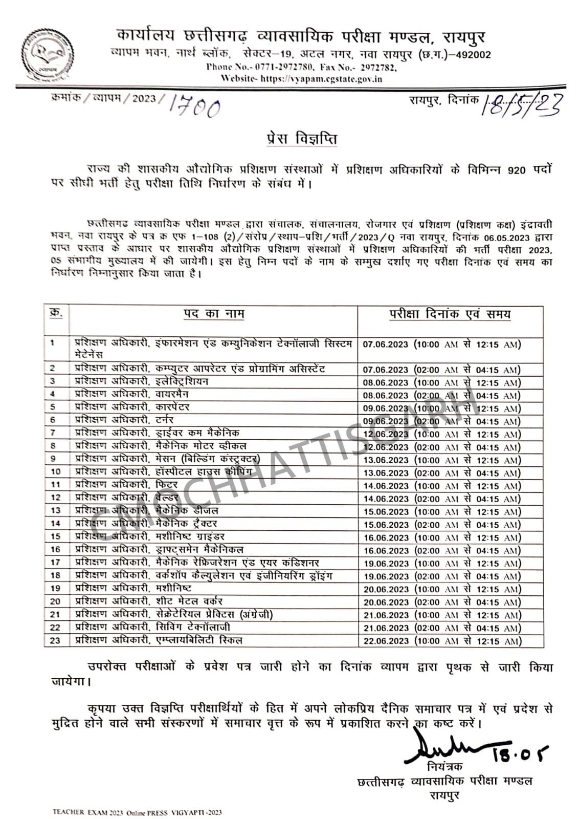 रायपुर ब्रेकिंग- आईटीआई प्रशिक्षण अधिकारी भर्ती परीक्षा की तिथि घोषित...