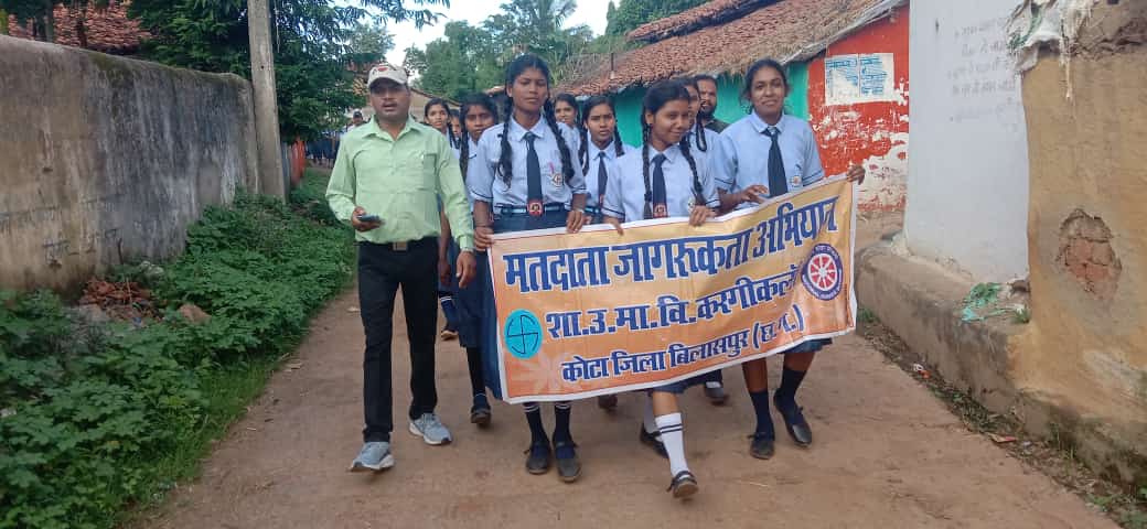 बिलासपुर, 30 जुलाई 2023/कोटा ब्लॉक के शासकीय उच्चतर माध्यमिक विद्यालय करगीकला, कोटा की स्कूली छात्रों द्वारा मतदाता जागरूकता रैली निकालकर ग्रामीणों को मतदान के प्रति जागरूक किया। छात्राओं द्वारा क्षेत्र में भ्रमण कर सभी नागरिकों को अपने मताधिकार का उपयोग करने का संदेश दिया। निर्वाचन आयोग के निर्देशानुसार जिले के विकासखण्डों में ईव्हीएम मशीनों का प्रदर्शन किया जा रहा है। इसी क्रम में कोटा के कलावती मिडिल स्कूल कोटा में आम नागरिकों के लिए ईव्हीएम मशीन का प्रदर्शन किया गया। बड़ी संख्या में ग्रामीणों ने ईव्हीएम मशीन के माध्यम से मतदान करने की प्रक्रिया को समझा। सेजेस बालक सरकण्डा के छात्रों ने मतदाता जागरूकता कार्यक्रम के अंतर्गत मानव श्रृंखला बनाया। आगामी विधानसभा निर्वाचन को दृष्टिगत रखते हुए निर्वाचन आयोग के निर्देश पर जिले में विभिन्न कार्यक्रमों के तहत मतदाता जागरूकता कार्यक्रम का आयोजन किया जा रहा है।