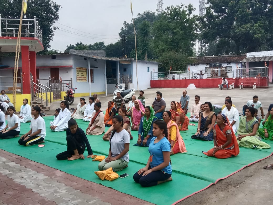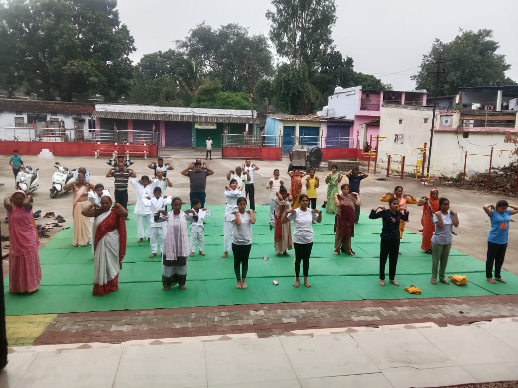 योग दिवस पर चिरिमिरी गोदारी पारा चीफ हाउस दुर्गा पंडाल मे योग का कार्य क्रम रखा गया