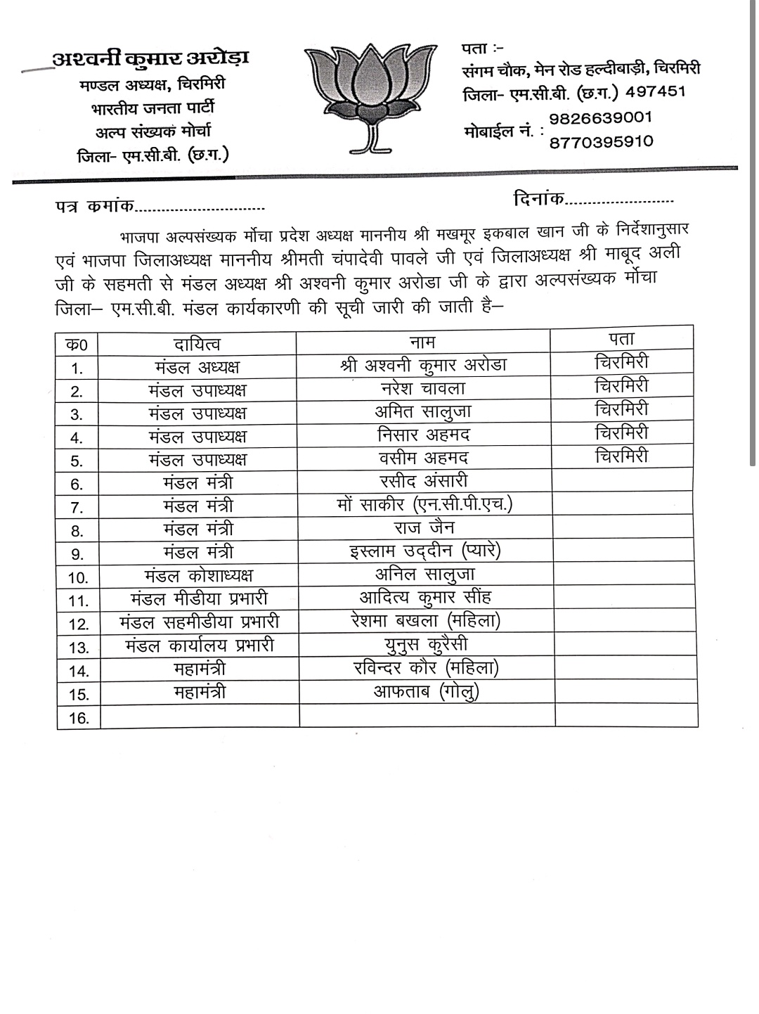 चिरमिरी- भारतीय जनता पार्टी अल्पसंख्यक मोर्चा, जिला एमसीबी की मंडल कार्यकारिणी की नई सूची आधिकारिक रूप से जारी कर दी गई है। यह घोषणा प्रदेश अध्यक्ष मखमूर इकबाल खान के निर्देशानुसार एवं भाजपा जिलाध्यक्ष श्रीमती चंपादेवी पावले एवं जिलाध्यक्ष माबूद अली की सहमति से की गई।