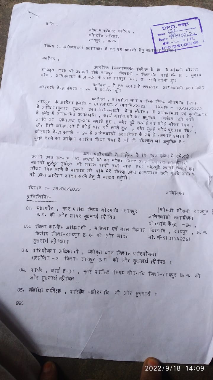 सहायिका को परियोजना अधिकारी,कार्यकर्ता,सुपरवाइजर,के द्वारा किया जा रहा परेशान सहायिका द्वारा लगाई गई कलेक्टर से मदद की गुहार